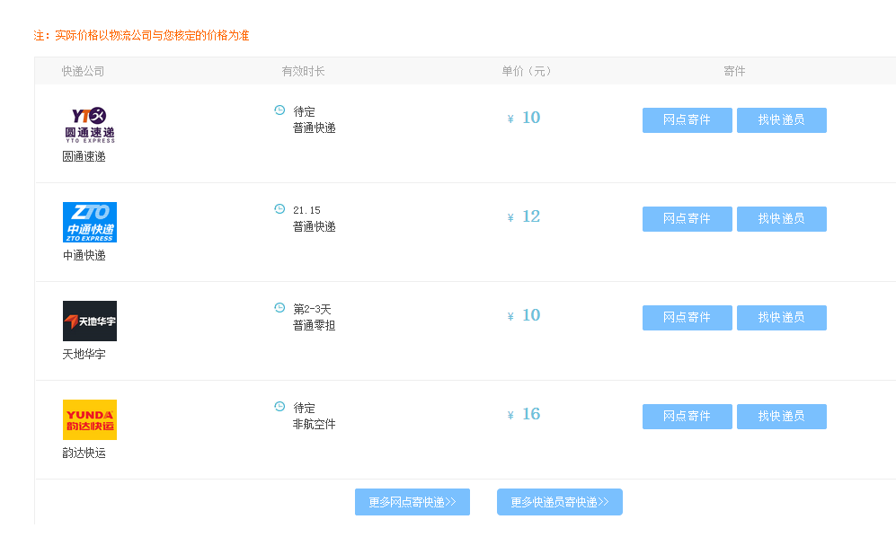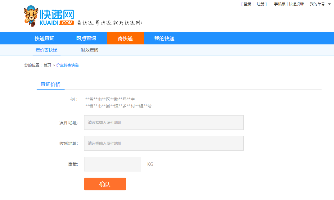 第二步:在“發(fā)件地址”選擇寄件地址,“收件地址”選擇目的地,重量輸入要寄的物品的重量,點“確認”,頁面會顯示可以到以選用的快遞,如下圖所示。其中可以看到有“網(wǎng)點寄件”和“找快遞員”