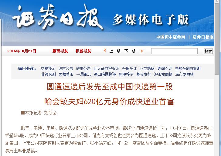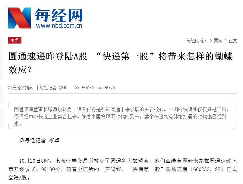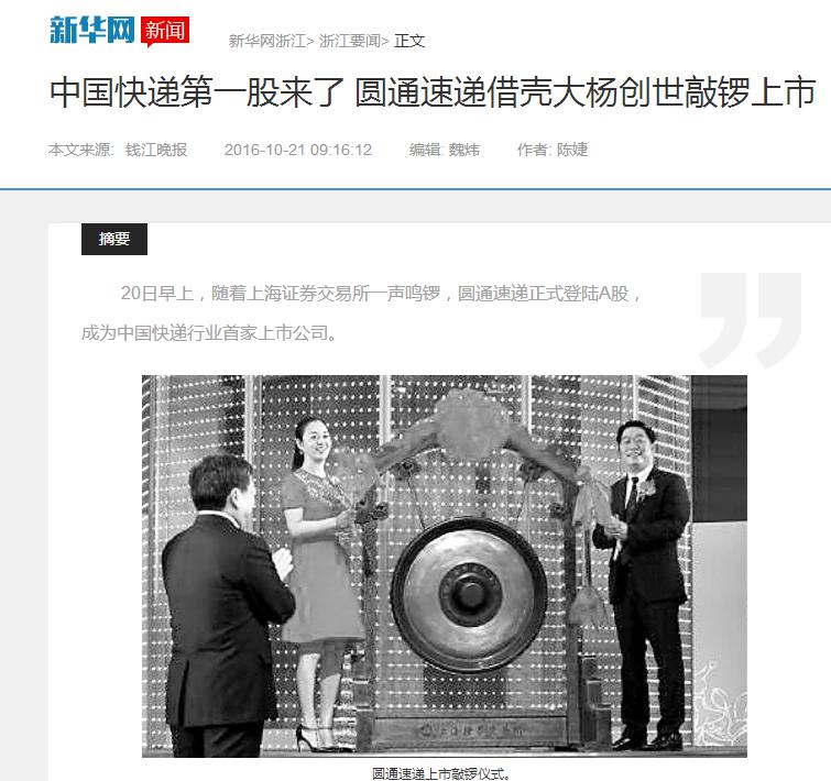 2016年10月20日上午9點(diǎn)30分,隨著在上海證券交易所一聲鳴鑼,圓通速遞股份有限公司正式登陸A股,成為中國快遞行業(yè)首家上市公司。