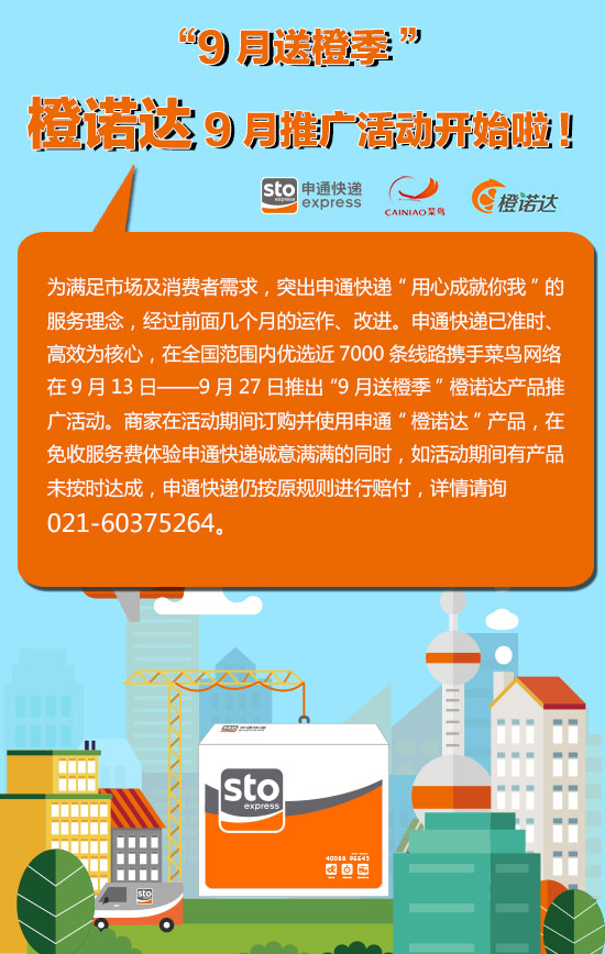 經(jīng)多日組織、籌備,九月十三日起申通快遞為迎合市場(chǎng)需求,進(jìn)一步拓展市場(chǎng)空間,搶占優(yōu)質(zhì)市場(chǎng)份額,發(fā)起了“九月送橙季”橙諾達(dá)產(chǎn)品推廣活動(dòng)。